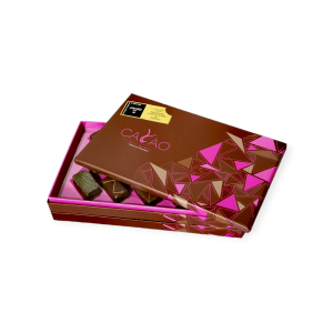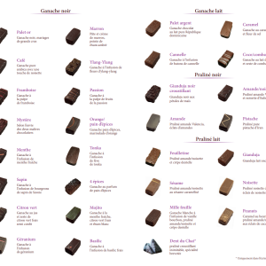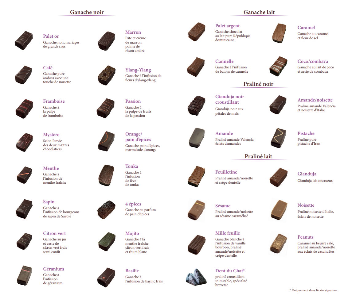 Ingrédients :chocolat noir 64%(cacao, beurre de cacao, sucre, lécithine de tournesol) ;chocolat lait 39%(sucre, cacao, beurre de cacao, poudre de lait, lécithine de tournesol) ;crème fraîche ;framboise ; passion ; lait de coco ; citron vert ;beurre frais ;sucre ; pâte et crème de marron ; menthe fraîche ; basilic frais ;café ; orange confite ; 4 épices ;cannelle ; huile essentielle (géranium ; ylang-ylang ; sapin) ; fève de tonka ;noisette(piémont) ; amande(valencia) ; pistache(Iran) ;sésame blond ; cacahuète salé ;maïs soufflé ;crêpe dentelle(Farine de blé, sucre, beurre, lait, sel, extrait de malt d’orge, poudre à lever : carbonates de sodium) ; combava ; rhum blanc et brun agricole ;fleur de sel ; gousse de vanille ; colorant naturel.