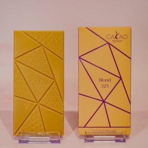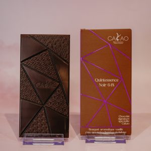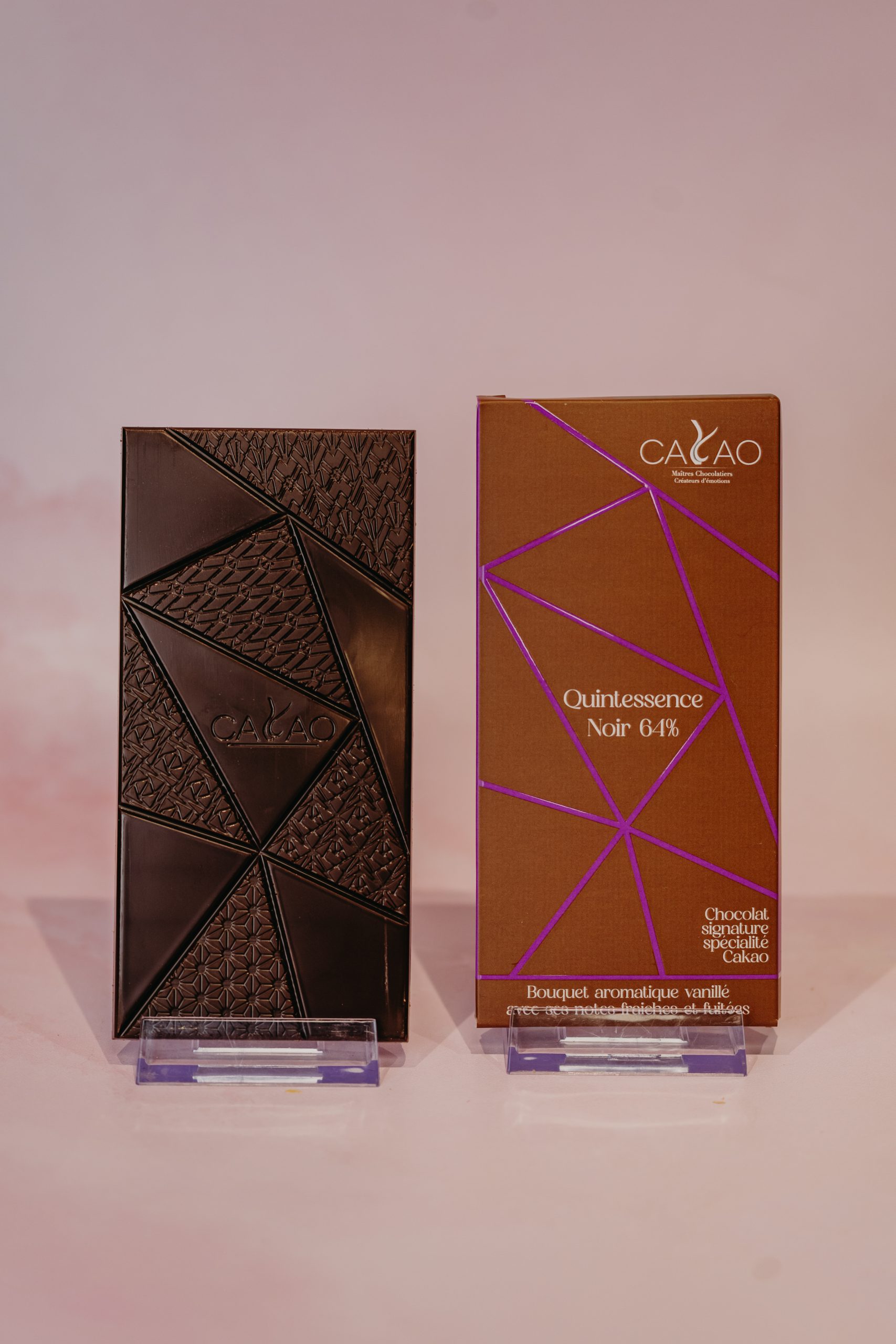 Le chocolat noir 67 % révèle toute l’intensité de notre Quintessence, profond et élégant. Le chocolat lait 39 % séduit par sa douceur lactée et réconfortante. Le chocolat blond 35 % dévoile de délicates notes de caramel, tandis que le chocolat blanc 36 % offre une rondeur subtilement vanillée.