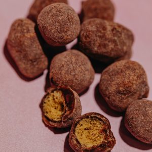 pop-corn enrobé de chocolat noir 67% avec une pointe de fleur de sel,