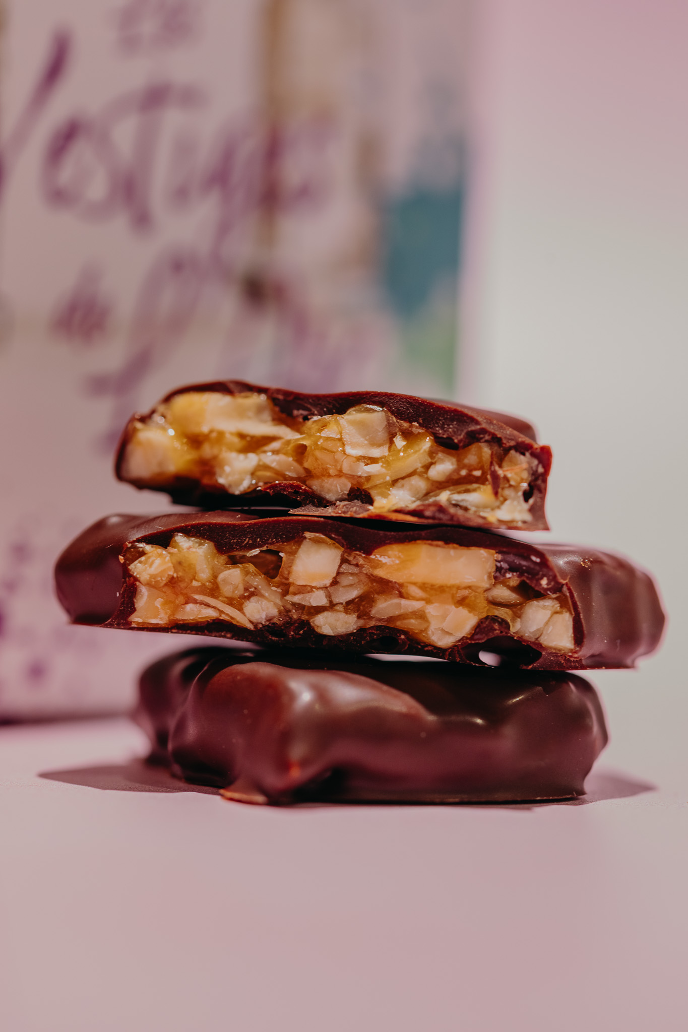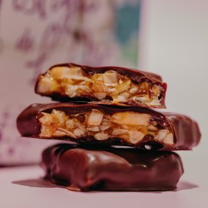 Ces éclats de nougatine aux amandes subtilement vanillée, enrobés de chocolat noir 67%, offrent un croquant fin et délicat.