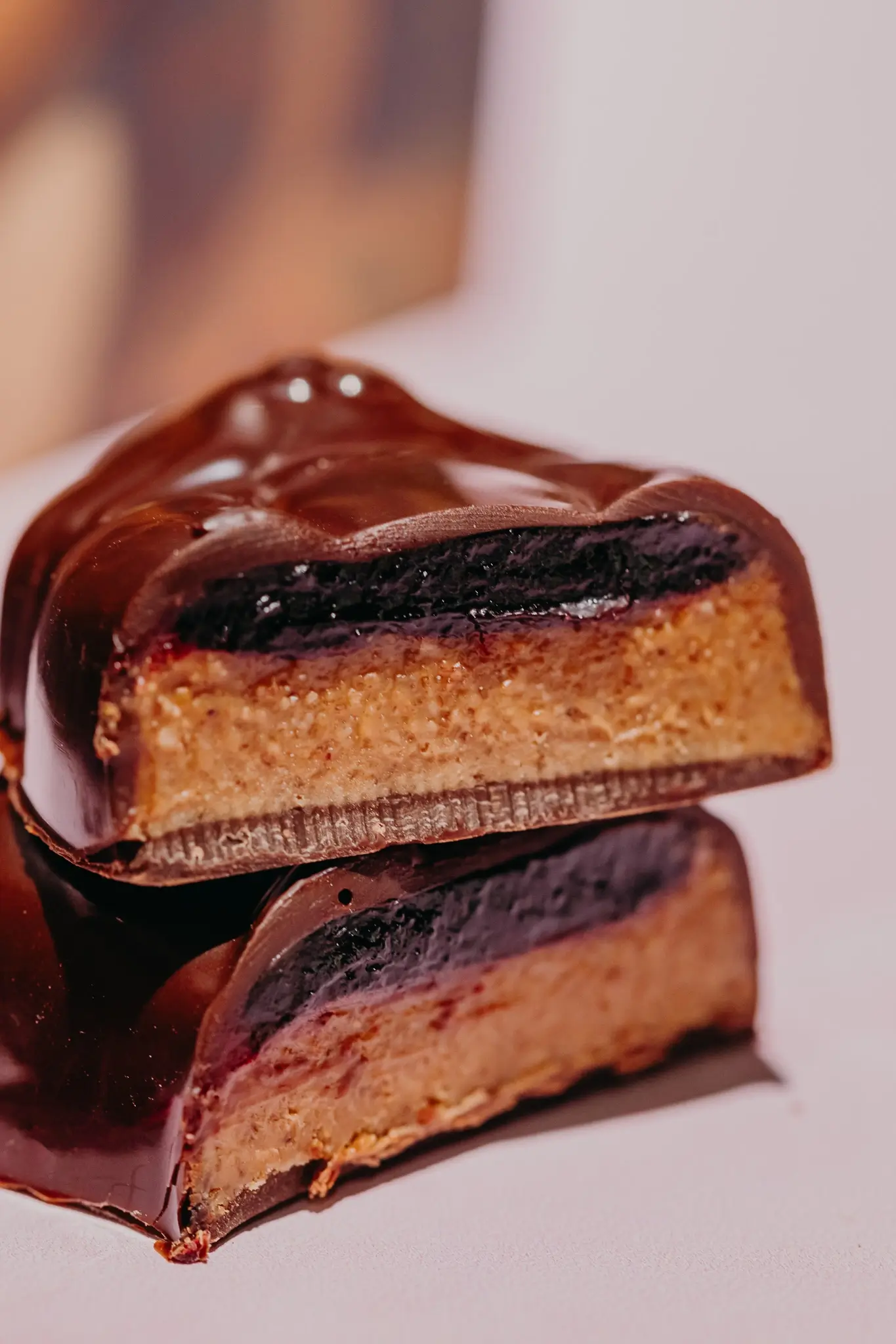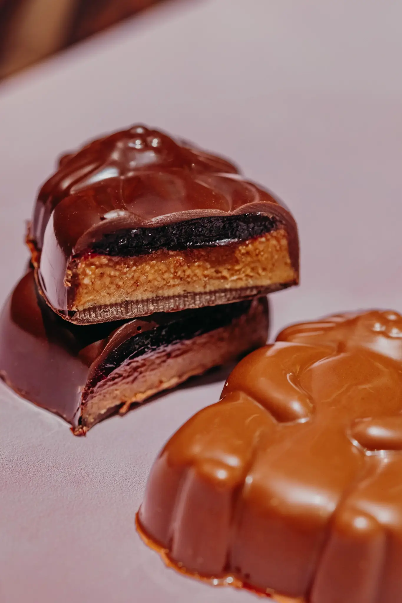 À l’intérieur, chaque pièce renferme un praliné aux noix du Dauphiné accompagné d’une confiture de myrtille, le tout délicatement enrobé de chocolat noir 67 % ou de chocolat au lait 39 %, pour une expérience gourmande et équilibrée.